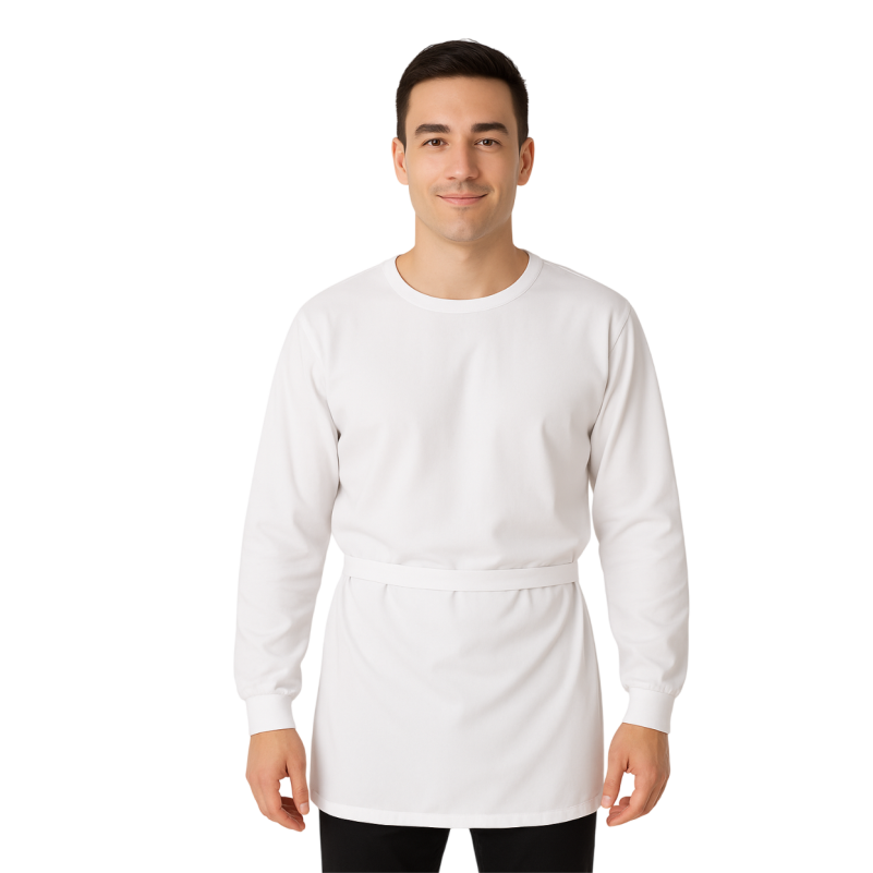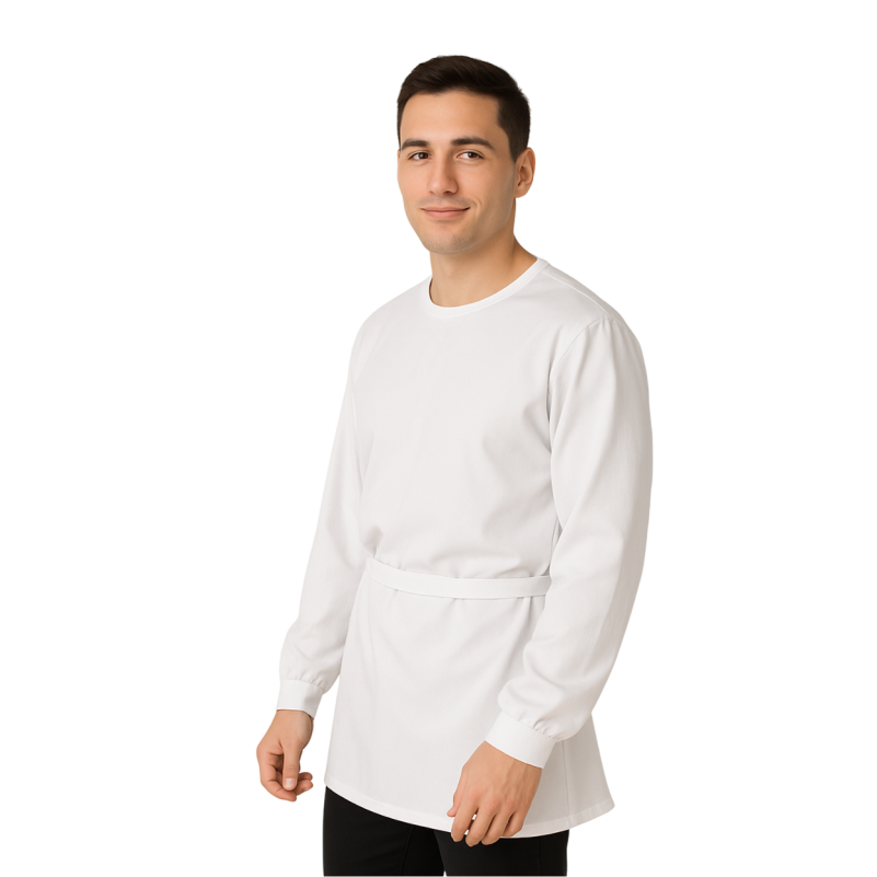 Jaleco hospitalar masculino de manga longa, desenvolvido para profissionais da saúde que necessitam de conforto e segurança no ambiente de trabalho. Modelo aberto na parte de trás, com fechamento em laço, garantindo praticidade e ajuste personalizado.